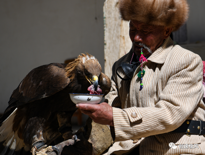 这时候驯鹰人给金雕喂食的肉也有讲究,不能给它们吃家禽家畜的肉,否则它就可能会去捕猎家里的动物,一般来说都是喂兔肉。