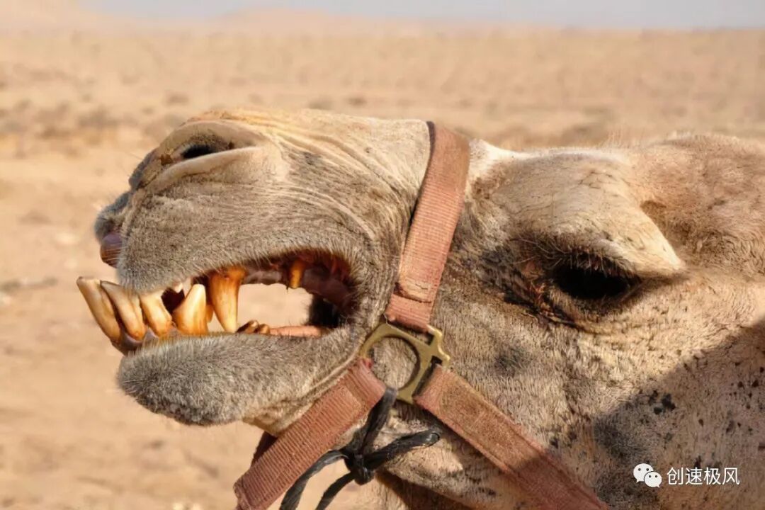 首先,家骆驼的生活环境特殊,一般遇不到大型天敌,偶尔会有狼群骚扰。尤其是在人类的庇护下,它们不需要进化出攻击性极强的身体特征来保命,因此它们看起来人畜无害。但是骆驼依然有两样防御武器,一是牙齿,二是腿。骆驼的上门牙呈獠牙形,臼齿为月型齿,虽然不如虎豹那样锋利尖锐,但十分粗钝坚固,如果人被咬中,不仅疼痛感极强,还会皮开肉绽。