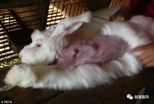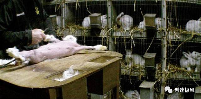 而兔子长大后,就会被工人抱到操作台上,为了防止它们乱咬,四肢也会被牢牢绑住,完全动弹不得。接下来就可以取毛了,有的工厂会使用锋利的剃刀,一层一层刮取绒毛,过程中难免划伤兔子,痛得兔子不停挣扎。 而有的黑心工厂则更残忍,直接上手活拔,全程不打麻醉,生生硬拔下来。这样做的目的一方面是能减少成本,另一方面是活拔下来的兔毛质量更好,能够获取更多的利益。