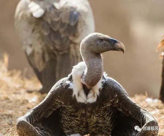 秃鹫,俗称座山雕,属于鹰科大型猛禽,体长可达1-1.2米,翼展更是达到了2-3米,当它们张开双翅翱翔时,颇有一种“死神”降临的既视感。不过,秃鹫的飞行能力和捕食能力并不强,它们通常低空盘旋来巡视领地上是否有动物尸体,飞行一段时间就会降落休息。它们的身体特征更有利于撕咬尸体,锋利尖锐的钩喙可以轻而易举地啄破撕开皮肤,拖出内脏。但是双爪较为粗钝,适合在地面站立,因此秃鹫的抓握力不够,无法像金雕一样抓起大型猎物离开,只能原地吃掉尸体。