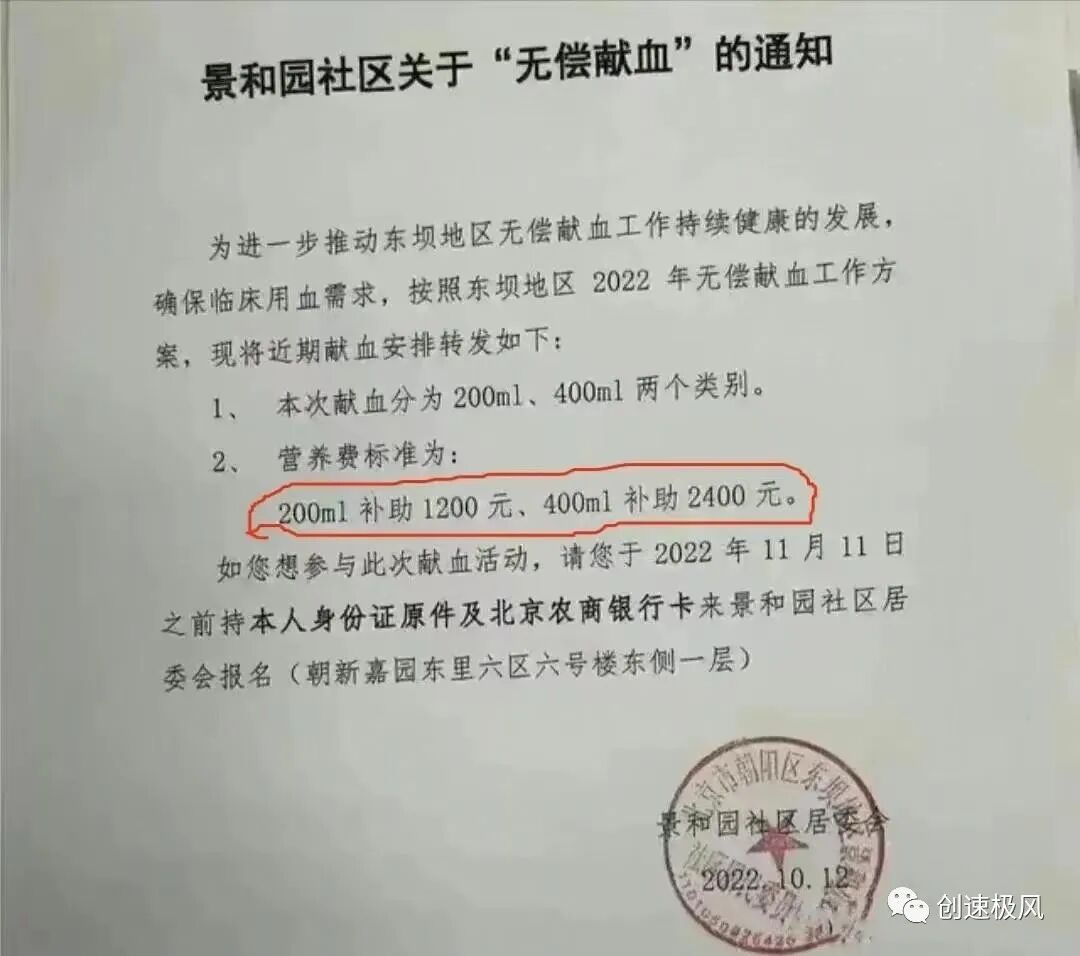 有网友晒出某小区的“无偿献血”通知,献200毫升补助营养费1200,献400毫升补助2400。