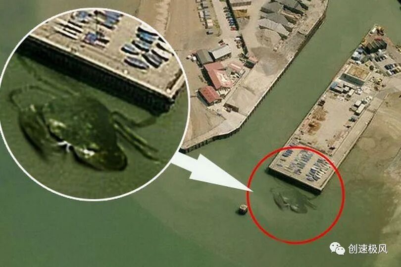 从配图来看,螃蟹的宽度将近有码头的2/3。它隐藏在码头下,看到有小孩在附近玩后,竟从水里伸出了巨螯,想要发起攻击。野外的螃蟹看到人就会跑,怎么会无端对人发起攻击呢?而且世界上真的有这么大的螃蟹吗?万能的网友根据码头特征,竟然找到了这个图片上的地址,就在英国的惠特斯特布尔。而且他们还根据码头的实际数据,计算出了这只螃蟹的真实大小。如果这只螃蟹是真的,那它的宽度达到了30米,加上蟹脚甚至能超过40米!
