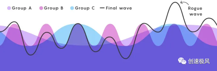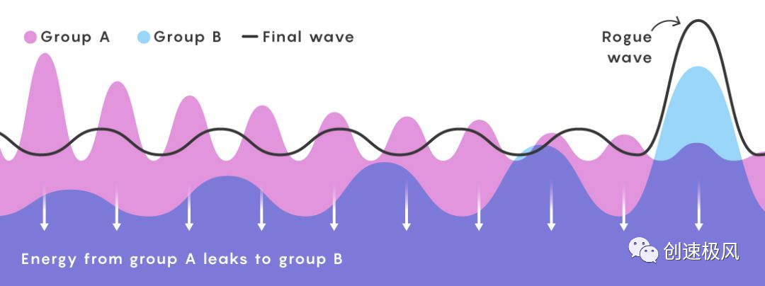 但是,能量并不会消失。它会转化成波浪能,在没有任何推力的情况也能移动。在移动的过程中,形成“涌波”,也就是长波,具有能量大,速度快的特点。所谓的“疯狗浪”,就是涌波。 在此之后,剑桥大学的科学家本杰明和费尔在实验室中造出了“疯狗浪”。他们发现当长波浪和短波浪相遇时,波中的能量,能够骤然集中于几个,甚至是一个“怪波”中。能量足够大时,就会形成“疯狗浪”。根据这一原理,他们造出了超级大浪,可到60米外的的地方。