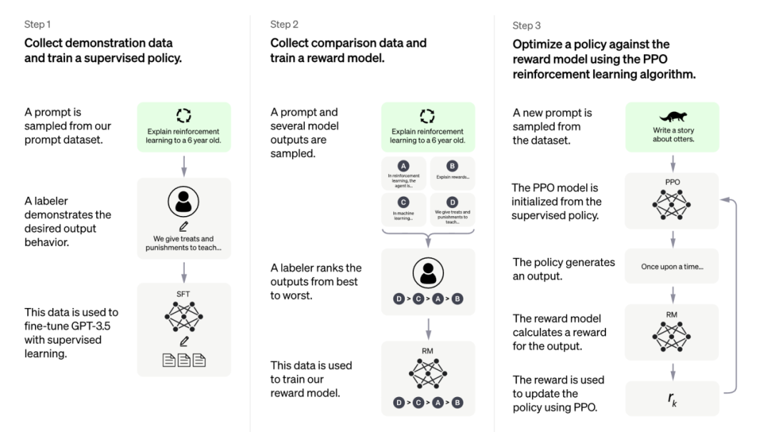 Open AI持续的研究中,不断探索引入新的技术路线。这次引入的强化学习方法,很好地提升了模型的效果。在研究中,Open AI在模型训练中,引入了人类专家。专家一方面帮助ChatGPT撰写更符合人类习惯的回答,另一方面,也对生成的结果进行排名,通过这样的奖励机制,实现模型的微调优化。