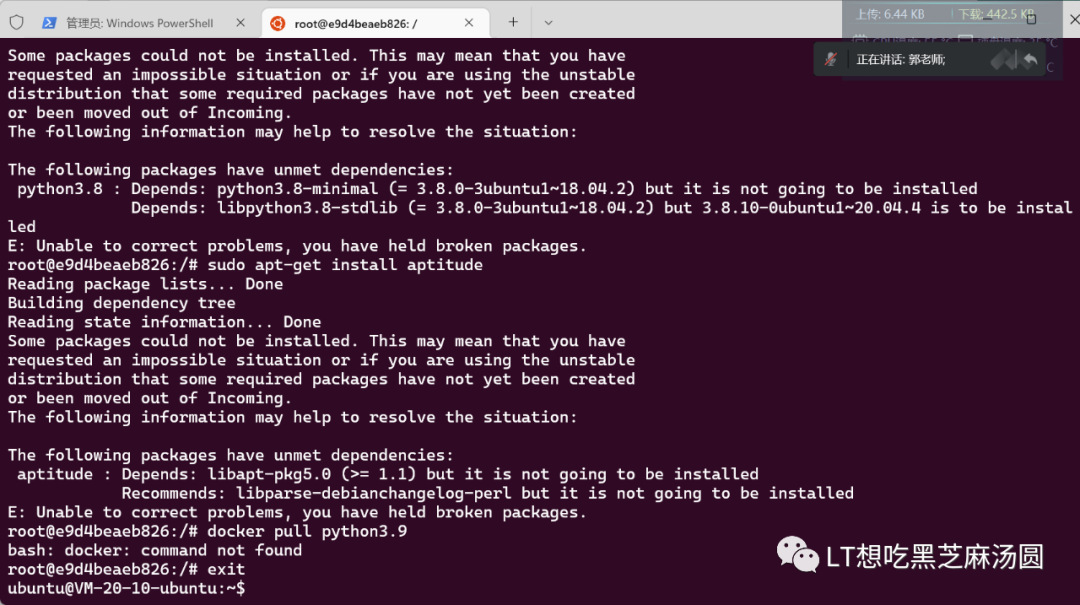 我认为问题应该是docker拉取的ubuntu是最小化的包,当我unminimize之后里边原来存在的包就起了冲突,所以没办法安装python,aptitude也是一样,而不unminimize的话,他似乎连https都读不了,缺点证书啥的。