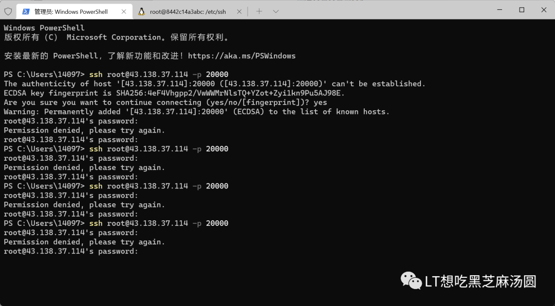 想在本地配置能用ssh直接进入docker,创建容器时把22端口映射到了20000,在docker内也装上了opensshserver,明明在云服务器端也开放了20000端口的,但就是不行