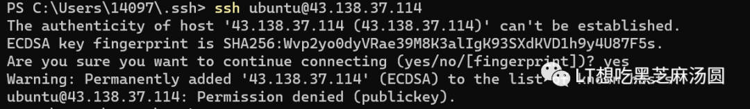 我在想这时候我的公钥到底在不在上边,如果不在,他应该会直接提示我输入密码,如果在,后来解决了问题时发现公钥明明没上边