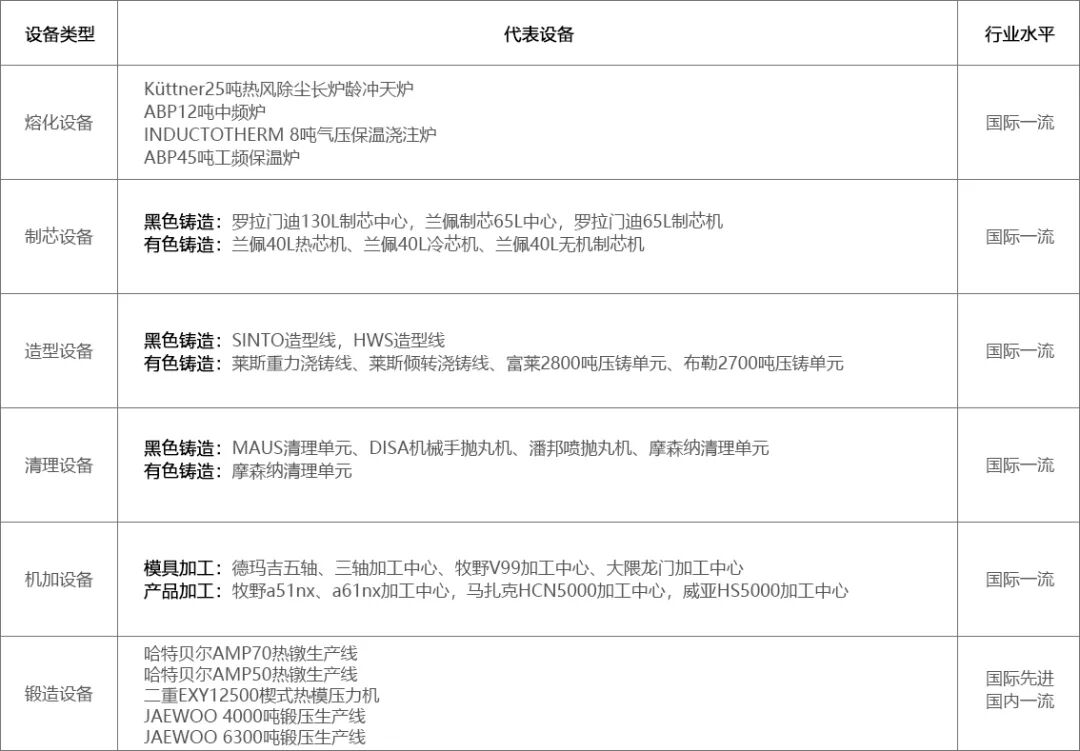 代表设备:德国Kuttner 25吨热风除尘长炉龄冲天炉、美国ABP 12吨中频炉、美国INDUCTOTHERM 8吨气压保温浇注炉、美国ABP45 吨工频保温炉