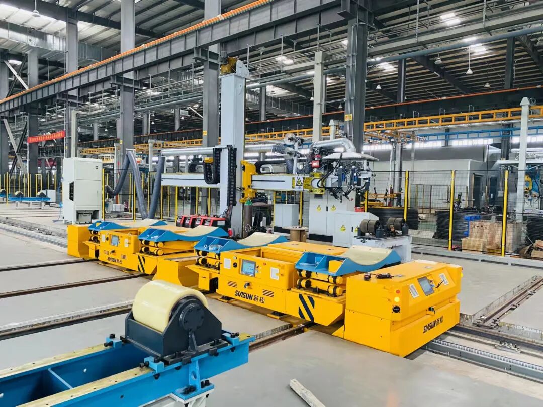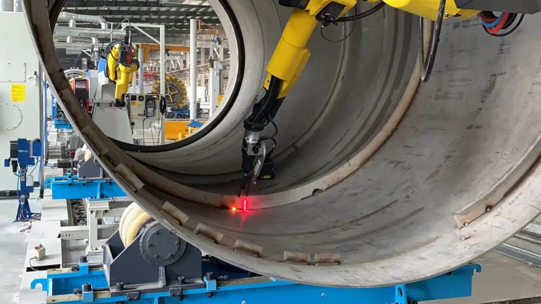 下面是加强筋焊接机器人,看样子像是新松自己的机器人,机器人焊接很常见,但这个项目的难点主要是机器人要安装在一个悬臂上,然后深入到筒体内部焊接,由于筒体较长(12米),对悬臂精度有一定的要求。