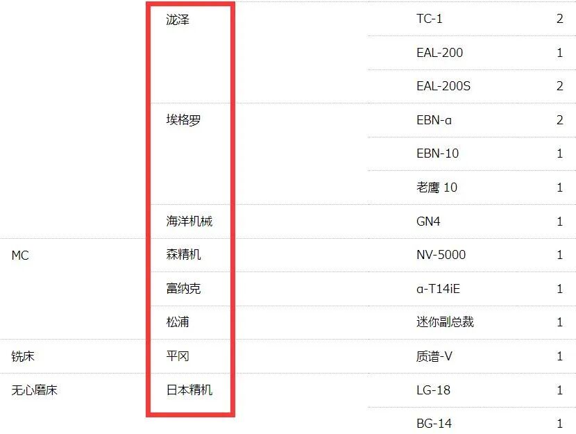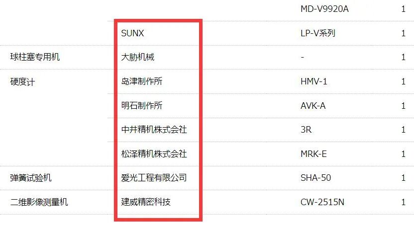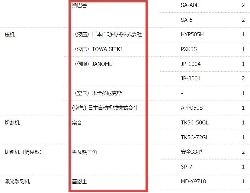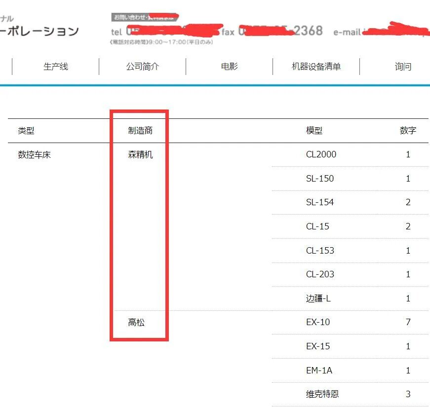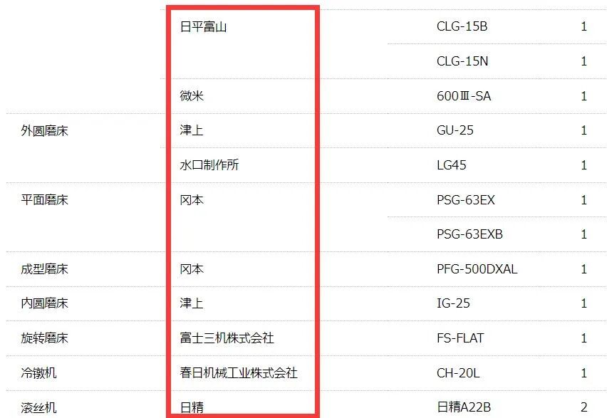 刚在看日本一个生产螺钉的小公司的官网,其中有一个 机器设备清单 的页面,没想到日本品牌的设备占比99%,包括森精机、高松、泷泽、发那科、日本精机、日平富山、富士三机、斯巴鲁、基恩士等,下面是这家日本小公司的机器设备详细清单: