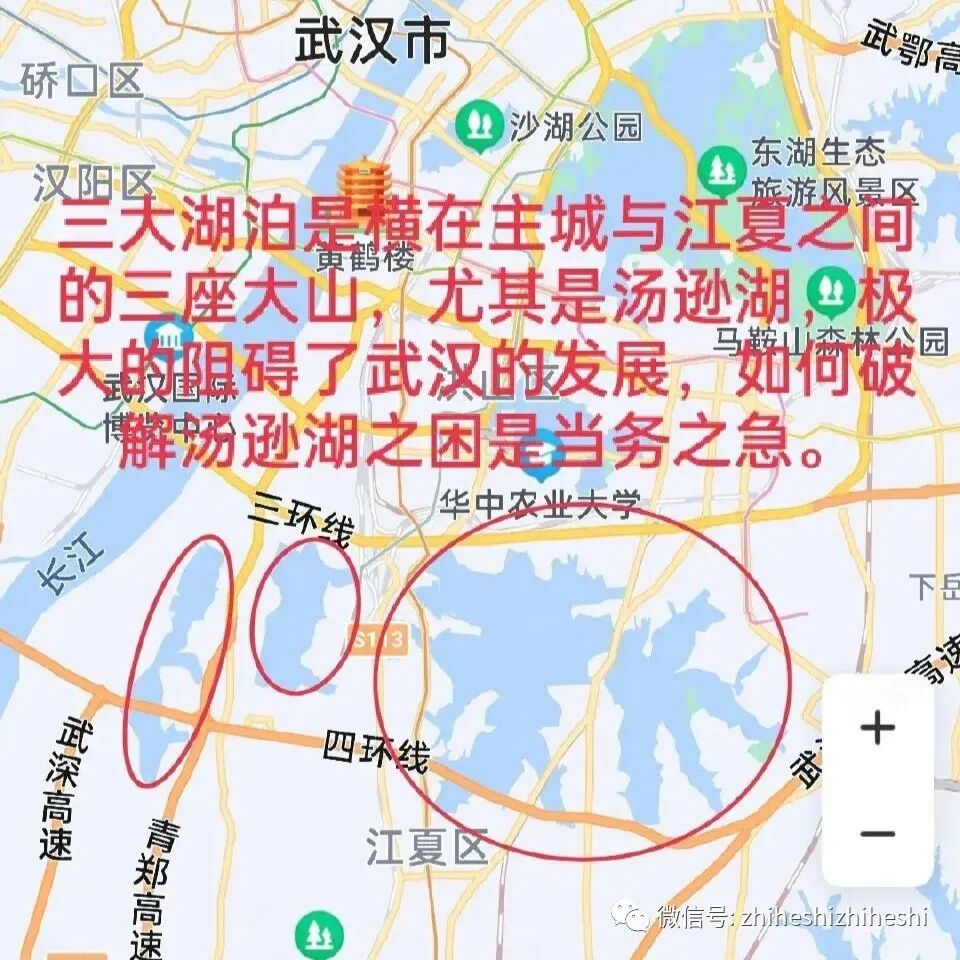 横在江夏区与市中心之间的三大湖泊,尤其是面积巨大的汤逊湖,极大的阻碍了发展,而东湖高新区则是与市中心无缝连接,一马平川。