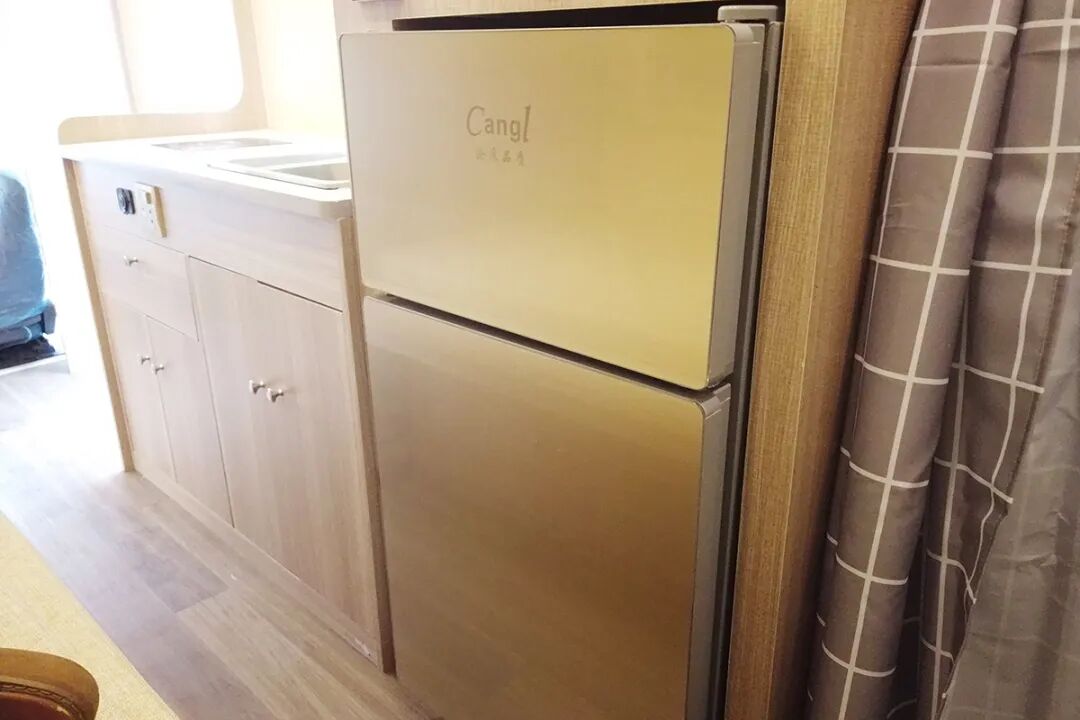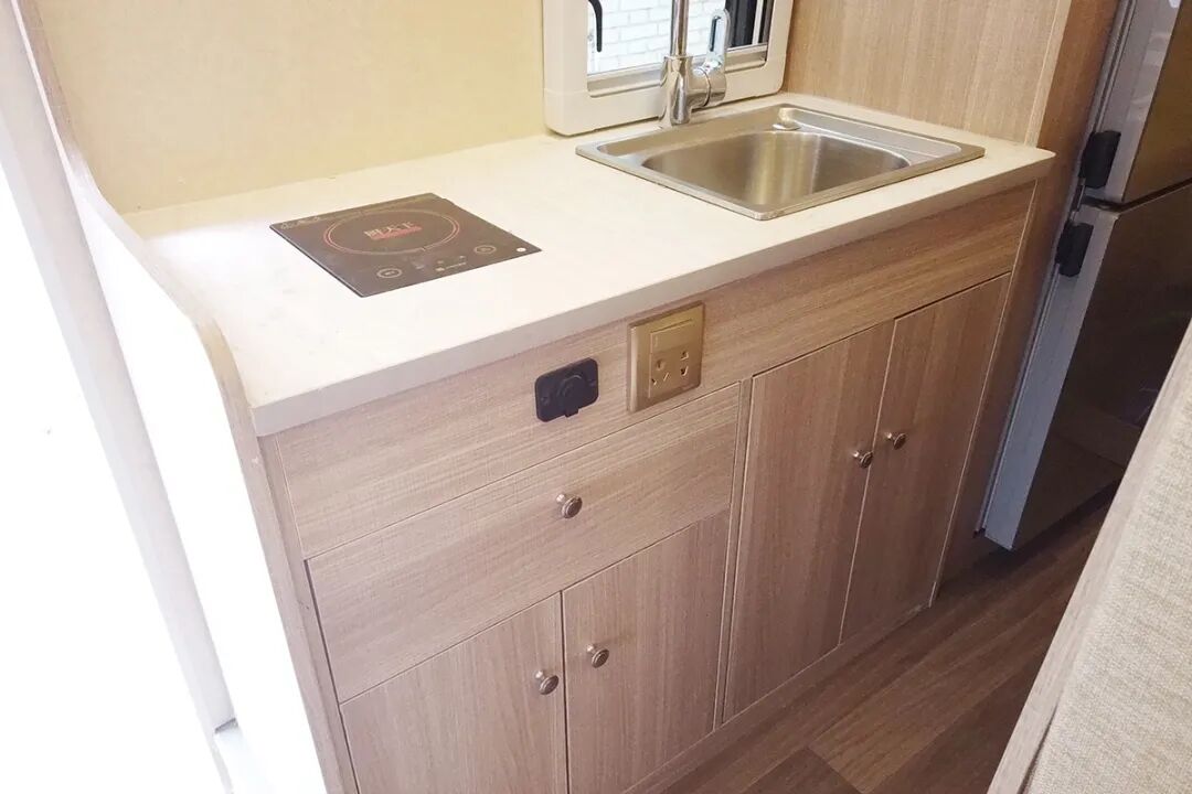 厨房区位于车厢中部,配备不锈钢洗手池、电磁炉及108L车载冰箱,周围配有220V电源插座及USB充电接口。