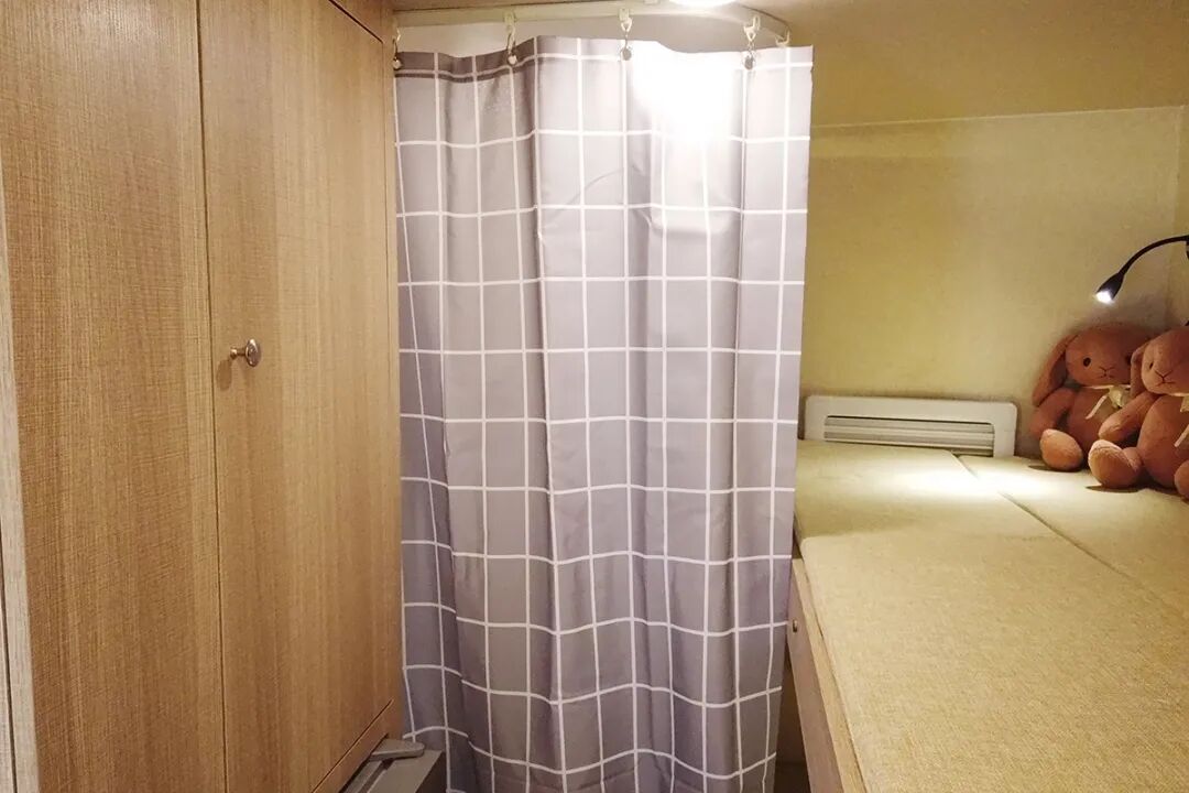 车厢尾部卫生间布局新颖,并未采用市面上常见的封闭一体式卫生间,而是由拉链式浴帘与周围隔开,形成独立一体式淋浴空间,这样的设计既优化了空间又提高了日常使用的效率。