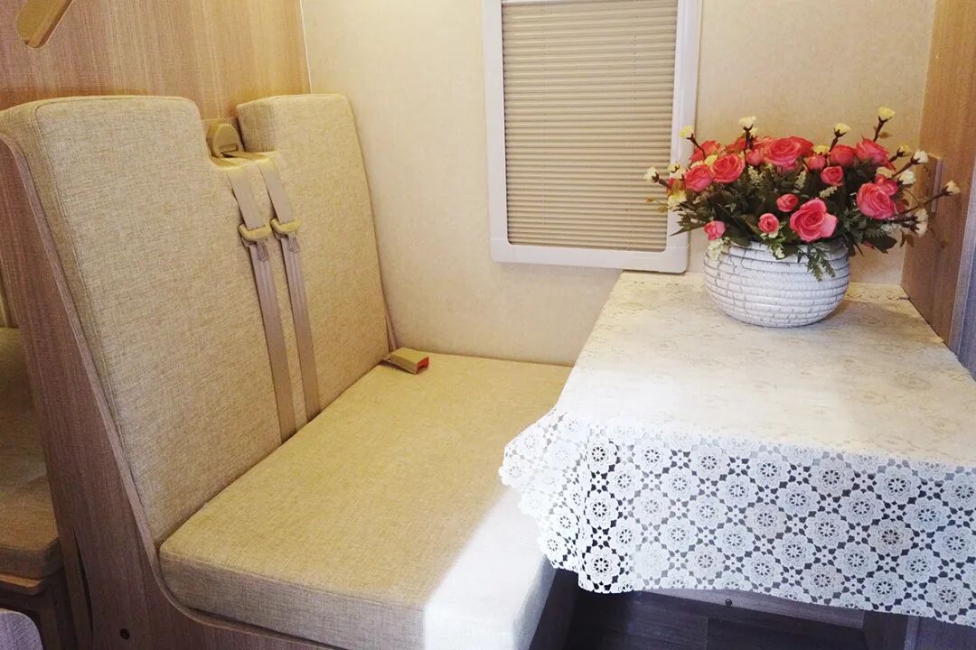 会客区采用单排卡座沙发设计,搭配可升降餐桌,降下后可临时拼成沙发床。沙发内侧墙壁上有外推窗,推窗上方有吊柜,方便日常使用。整车核载4人,此外会客区上方还可选装顶置空调。