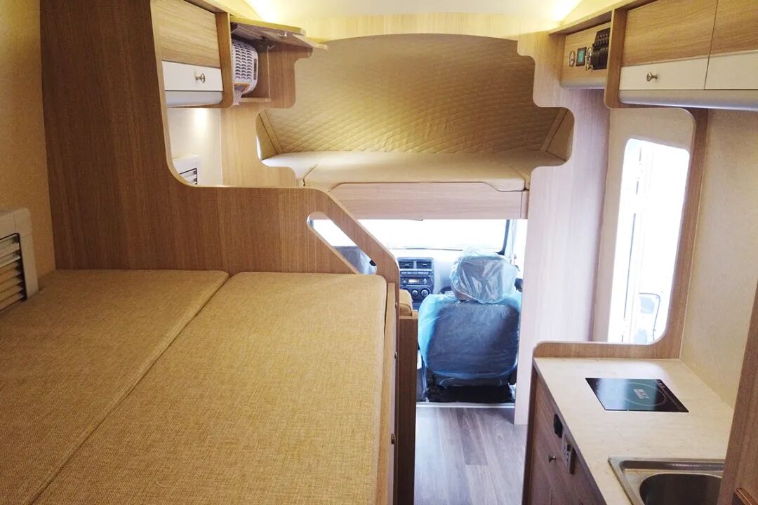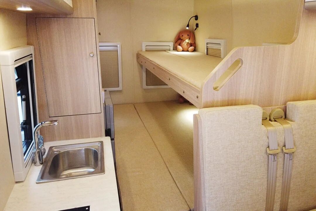 车尾采用纵置上下床布局设计,上铺尺寸为2000×750(mm),下铺尺寸为2000×1200(mm)。床铺均标配床垫,为用户后期节省了一定花销。值得一提的是下铺床设计有外延伸床板,增加了下铺乘员的睡眠空间。