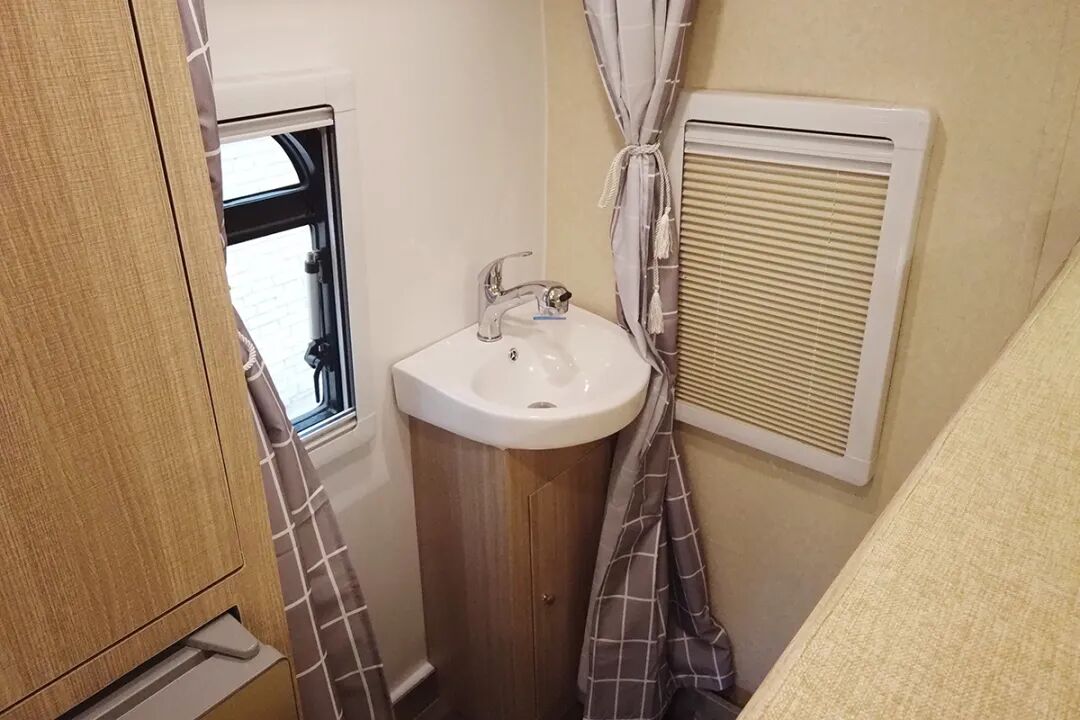 内部配备便携式座便器、洗手池、梳妆镜、毛巾架及淋浴设施,配套设施可选装换气扇。水路系统方面,净水箱容积为120升、灰水箱容积为67升。(注:图片由新飞房车提供)