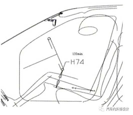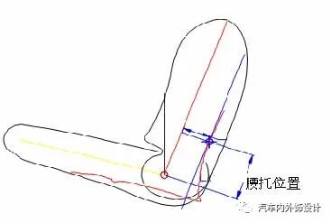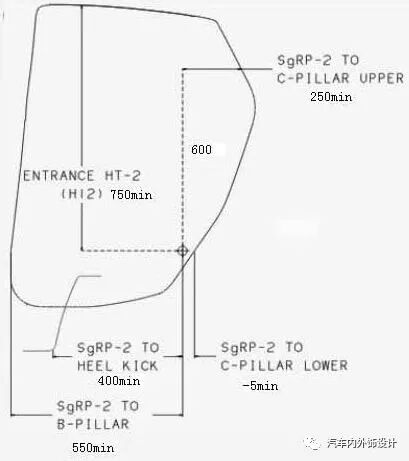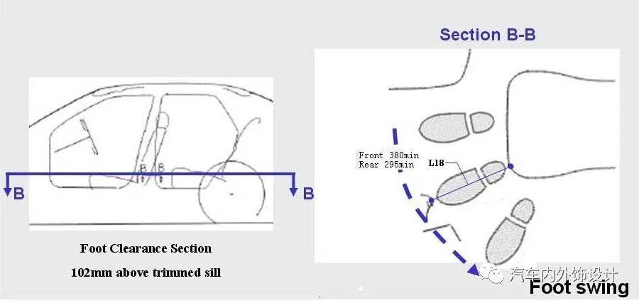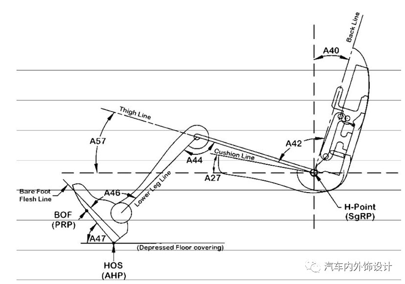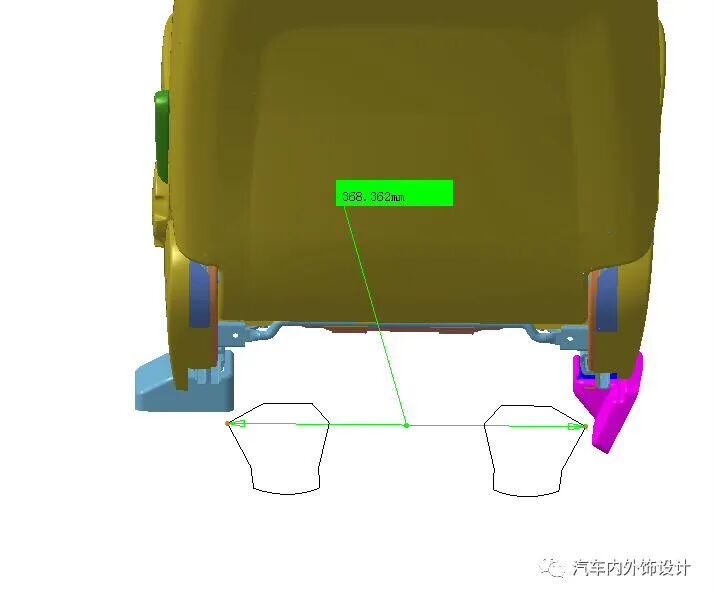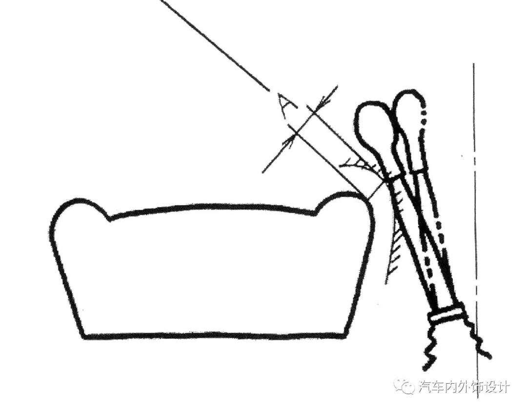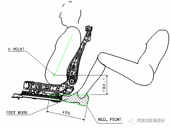脚部空间宽度:一般后排乘员置于前座椅下的脚部空间宽度上取后排布置人体模型不低于三只脚的放置空间,见下图。