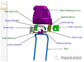 棘齿结构,共由三个锁止档位和一个回位档位组成,头枕每档的移动距离,是根据回旋轴到LINK的距离进行设定的。