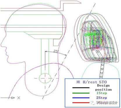 2)头枕向前向上同时调节,可以理解为向斜前方向运动