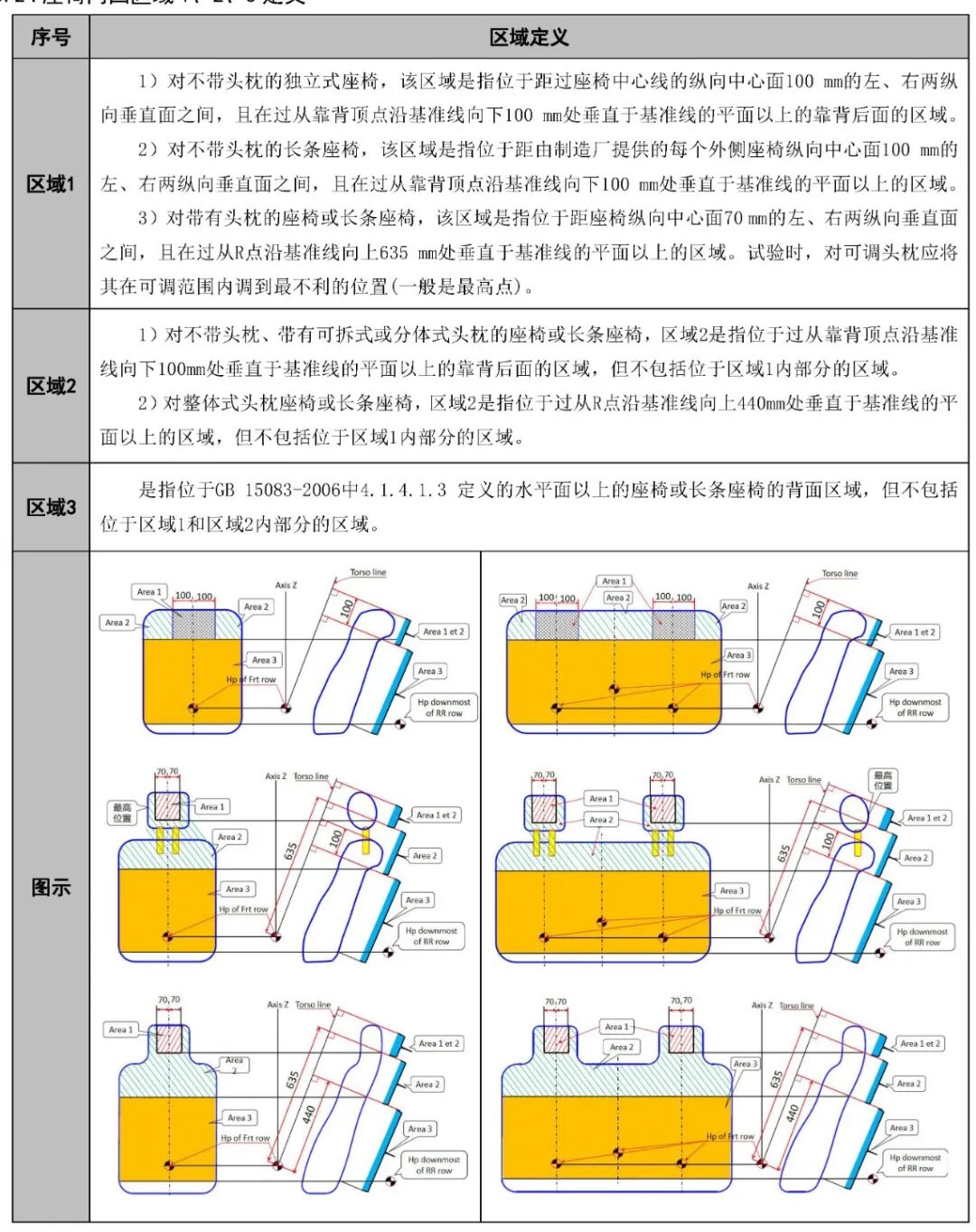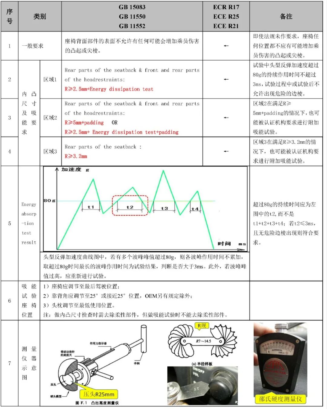 座椅内部凸出物的执行标准:GB 15083-2019、GB 11552-2009、ECE R17及ECE R21;座椅内凸若满足GB 15083/ECE R17,可视同满足GB11552或ECE R21;
