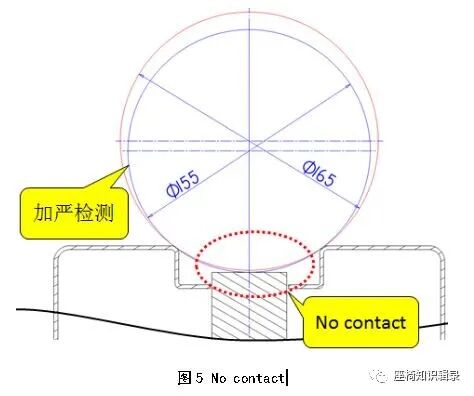 4)法规GB15083-2006中规定的区域1、2、3内的座椅后部表面(不接触区域不考虑内凸要求,如下图5中No contact),这些区域应位于最后排座椅乘员躯干线横向平面之前。设计中尽可能用φ155mm球体加严校核,或要求内凸圆角半径比法规要求大20%以上。