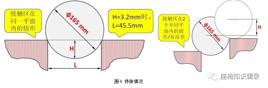 特殊情况:如图4所示,当L《45.5mm时,表面内凹的两侧棱边凸出物高度是达不到3.2mm的,若棱边的宽度大于棱边高度的2倍,则此时内凹两侧的棱边圆钝即可,其曲率半径无需满足法规要求。