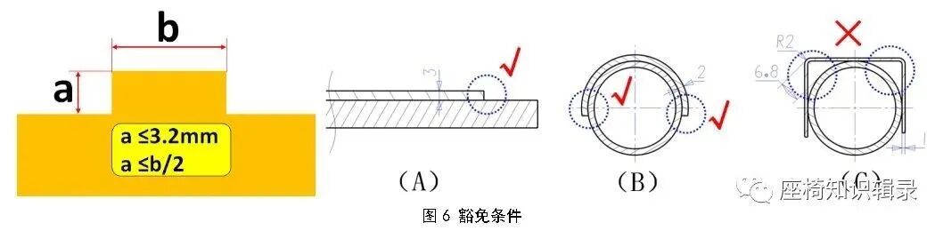 【例如料厚小于3.2的板件搭焊到其他板件上,焊接位置是不考虑内凸要求的,如下图中的A、B情况可行,C则需按内凸要求进行设计。】