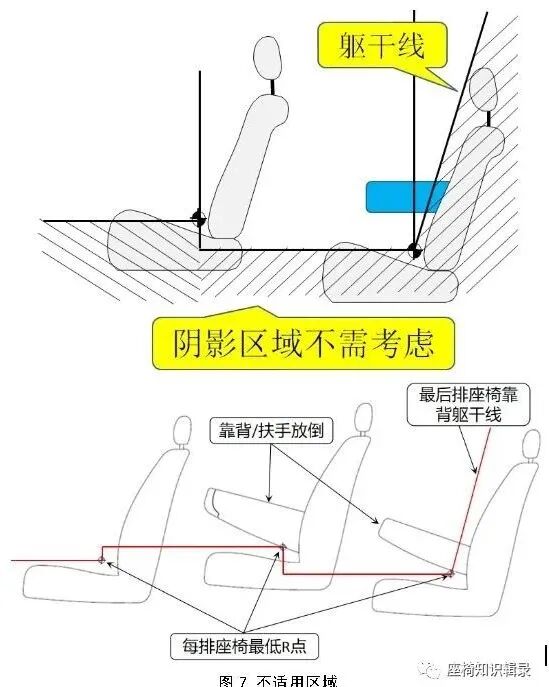 d)如下图7所示,位于通过该排座椅最低R点的水平平面以下的座椅靠背部分(如果每排座椅高低不同,则从后排座椅起,该水平面应通过前排座椅的“R”点,在垂直方向或高或低形成一个台阶)。