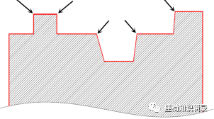 表面上的凸起棱边、表面内凹后的两侧棱边、表面上的台阶面,如下图1。