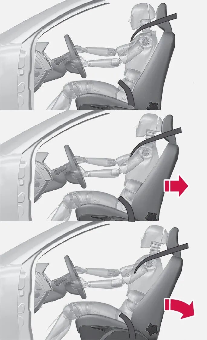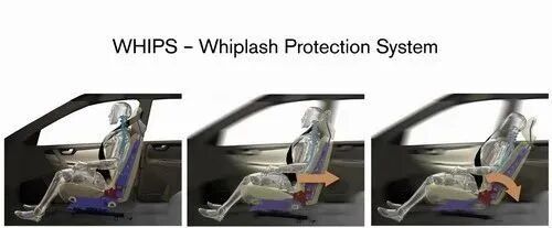 在收到后碰撞时,乘客由于惯性向后运动,从而带动座椅靠背骨架里的头颈部保护系统(WHIPS系统)启动,前排座椅靠背吸收能量会向后降低,以改变驾驶员与前排乘客的坐姿。这可减少遭受后撞引起的颈椎扭伤的危险。