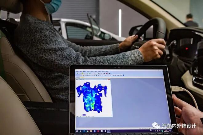 通过布满压力传感器的感应垫记录人体坐在座椅上各部位的压力值,分析人体与座椅接触的面积和各区域压力的分布,来评价座椅对于人体各部位(肩部、背部、腰部、臀部、大腿等)的包裹性和承托效果,接触面积越大、压力分布越分散、无压力集中区域,为座椅优异的表现。凯捷前排靠背接触面积表现出色,坐垫接触长度较好,对大腿支撑良好;腿托接触面积较大,承压合理无异常压力点,对人体各部位都有很好的包裹和承托。