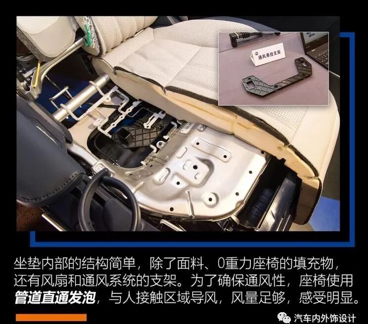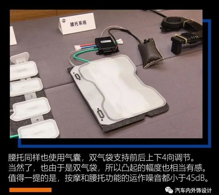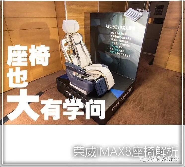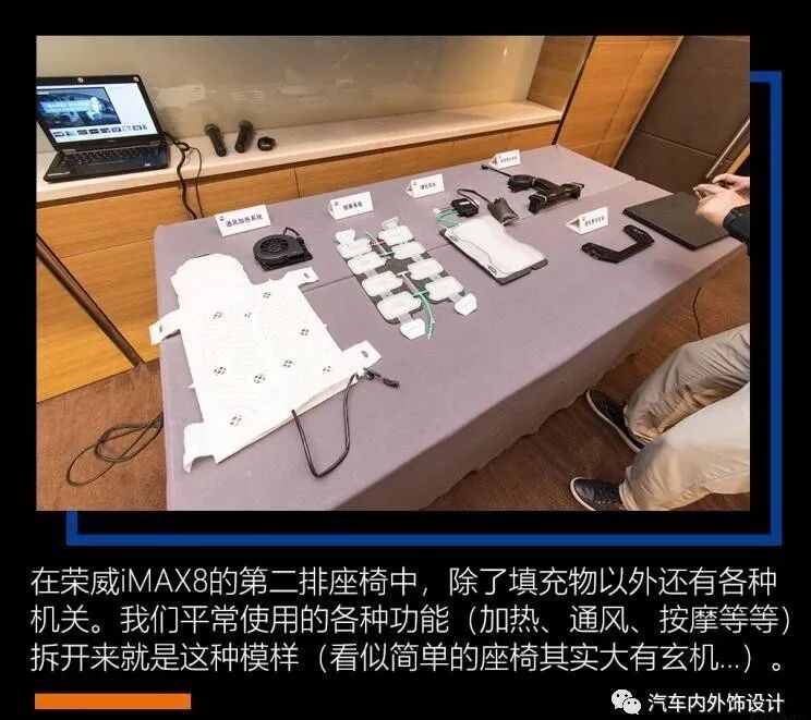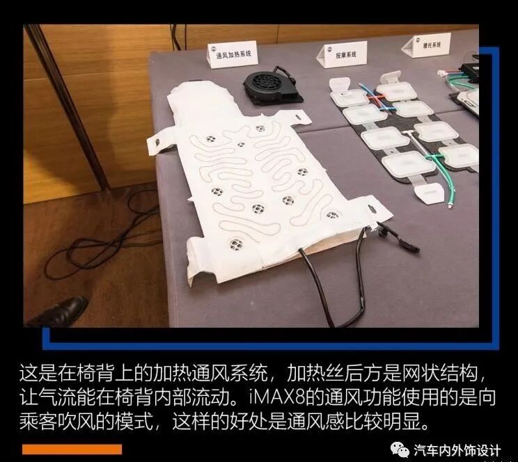 iMAX8的座椅看起来不止好看,功能也很齐全。在会场中,有一张剖开的iMAX8第二排座椅,以及一字排开的座椅零件。这些零件是提供按摩、加热通风等功能。椅子里面塞了那么多配件,也难怪原厂座椅的重量会那么高。