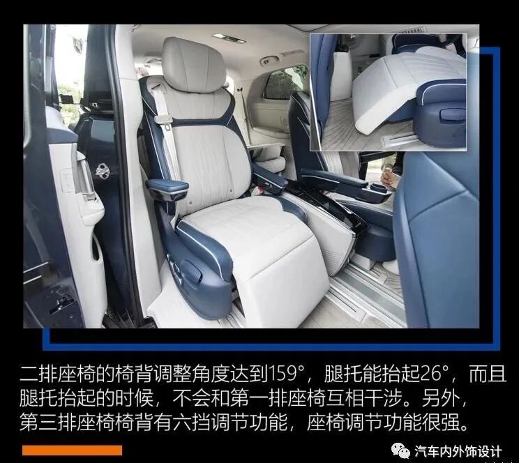 看到实物,会觉得座椅设计带有很强烈的商务气息,而且看得出这款车最强调第二排乘客的舒适性,因为第二排座椅的调整功能是最强最丰富的。