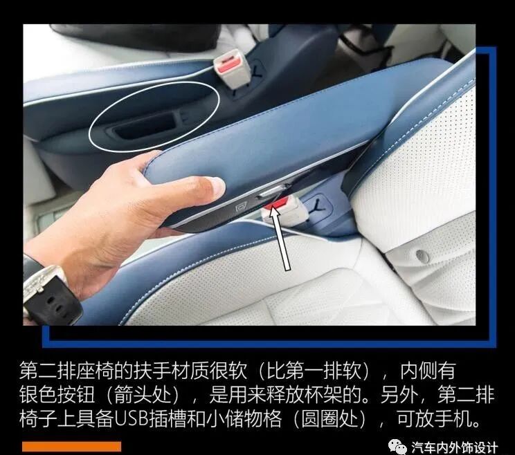 还有现在人基本上都是便携式设备的重度使用者,坐在车上就是想看手机,所以第二排的两张座椅上各有一个USB插槽和小储物格(可用来放手机),照顾到了第二排乘客的需求。