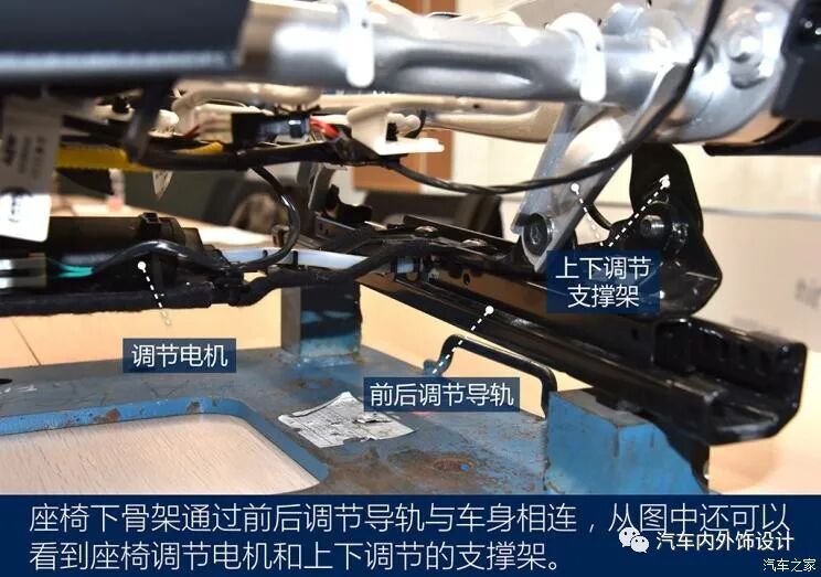 座椅下方则是实现前后滑动的导轨以及上下调节的坐垫支撑架了,这一部分结构手动调节与电动调节座椅相差不大,电动调节座椅增加了电机和控制机构。