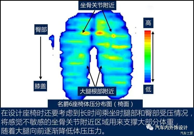 不过座椅的椅背和椅面也不是越软越好,以椅面为例,由于身体不同位置皮肤对压力的敏感度不同(臀部对压力的敏感性低于大腿),就需要将重量的主要支撑位置设计在屁股附近,并从臀部往膝盖方向逐渐减少体压压力。