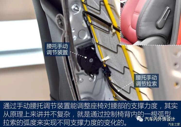 冲压的骨架并不能对椅面和椅背形成支撑,因此需要在横向添加支撑物,这里用到的是钢丝弹簧。用于展示的这款全新名爵6的座椅腰托采用手动调节的形式,通过调节安置在椅背上的一根横拉索的弧度来实现不同高度的腰部支撑变化。
