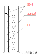 将加热线通过热熔胶固定到两层基材之间,类似于三明治结构。