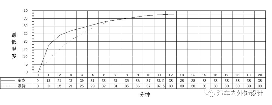 在每一个测量分钟时间点,座椅表面的最低温度情况如图所示。
