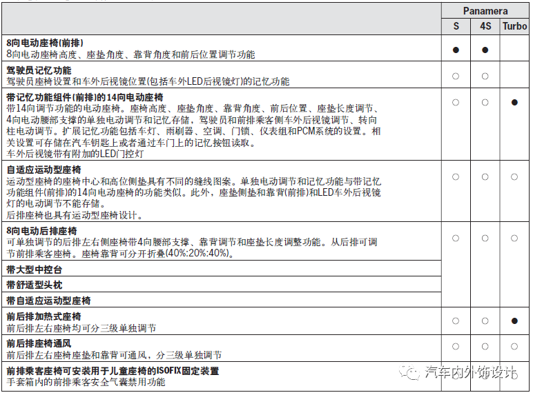 Panamera车型在继承了保时捷运动风格的同时,还提供了实现最佳乘坐舒适性的多种选项。Panamera标配前排电动座椅具有8向电动调节功能。座椅可提供优异的侧向支撑,同时其所具备的多种调节选项还可以使座椅与身形贴合。在座舱后排,两个带可折叠中央扶手的单独座椅非常舒适,为身材较高的乘客也提供了宽敞的腿部和头部空间。