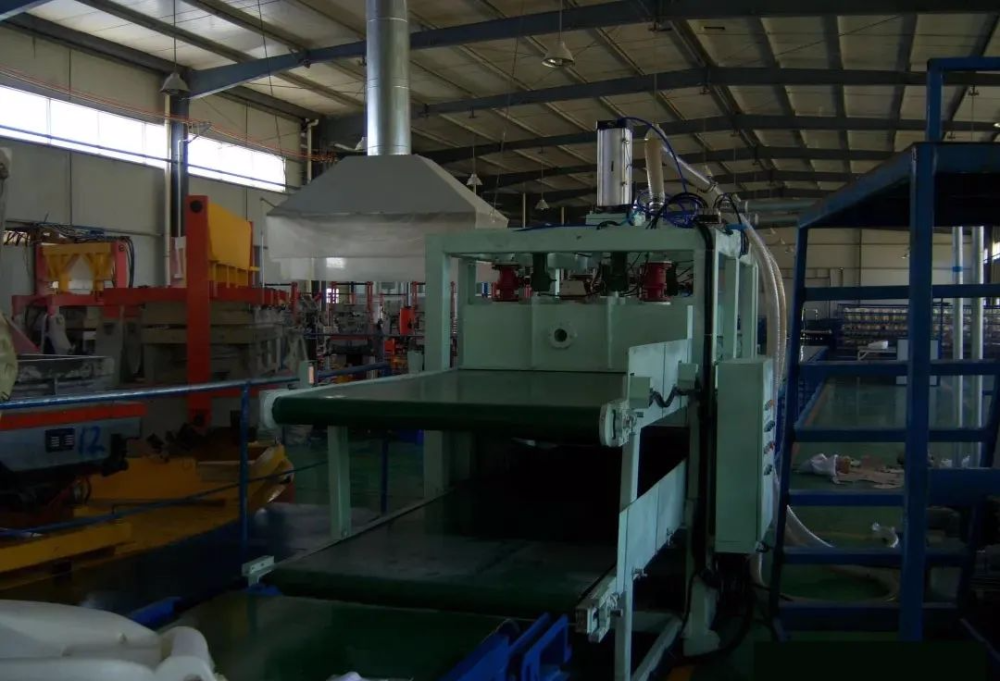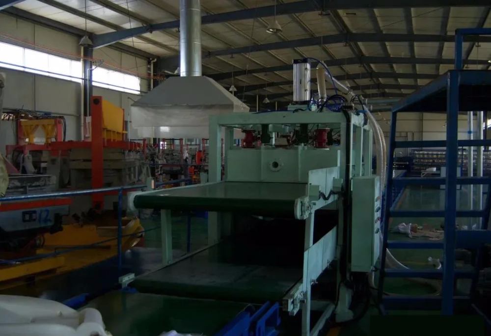 一般设计为多工位的转盘式生产线。模具一般使用模温机加热至45-70℃,然后通过浇注PU料发泡反应完成后脱模。脱模后制品需要使用破泡机帮助开孔。