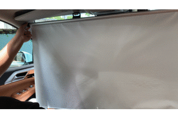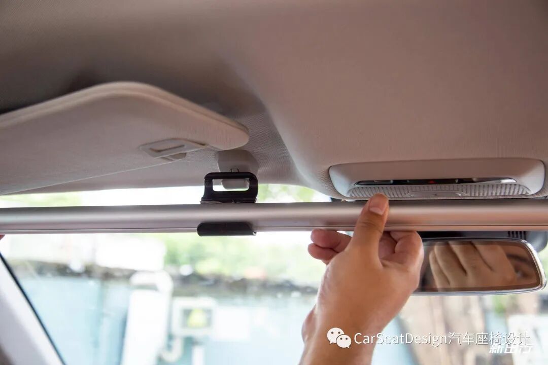 前排幕布安装十分简单,只需要将前排两侧的遮阳板取下,再将幕布固定在遮阳板上就可以了。幕布的收放也比较方便,左边这一侧有一个开关可以控制。