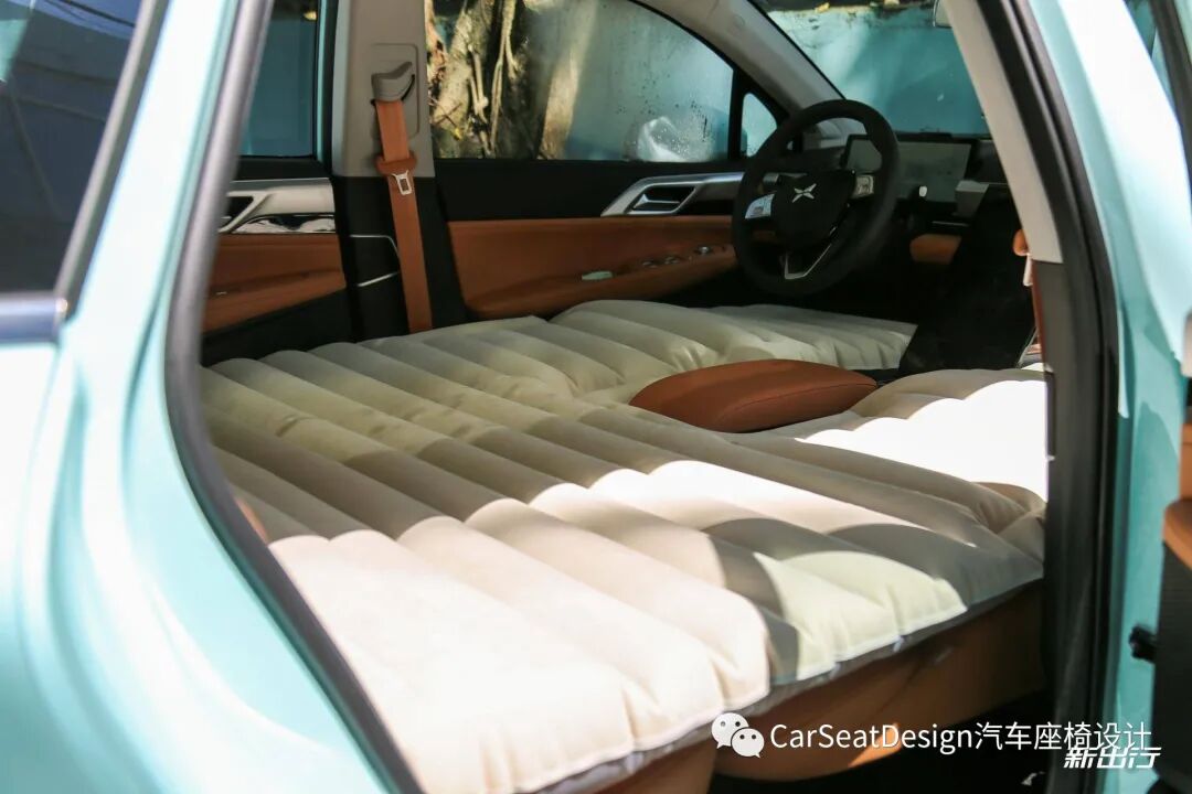 放进充气床垫前,需要将前排座椅放倒,这时候你可以通过语音唤醒“小P”进行放倒座椅。但前提是需要将前排两个头枕拿下并且后排无人的情况下才可以完成。在我们首次给充气床垫充气时,选择了在车外充气,再将充气完成的床垫放进车内,其实正确的做法应该是在充气前就应该将床垫铺放在座椅上方。