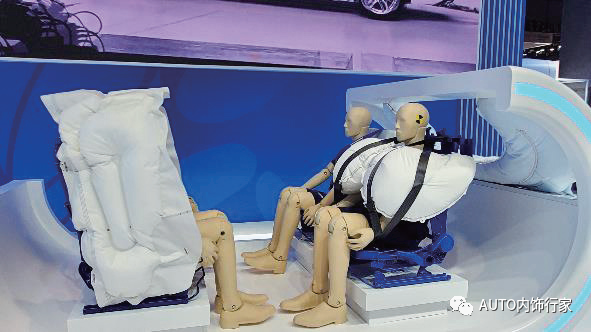 作为汽车上的被动安全装置,安全气囊在对乘员的保护中发挥了重要的作用。由于目前大部分汽车座椅都是朝向汽车前进方向的,当发生事故时,内置在中控台和转向盘中的安全气囊可为乘员提供安全保护。而在未来,汽车智能座舱将有多种驾驶模式,前排座椅可实现旋转调节,对于这种模式,现有的安全气囊将不再能为乘员提供安全保护,因此布置在座椅内部的大面积安全气囊保护将是未来座椅安全的有利选择之一。图1为某公司推出的座舱安全解决方案,它通过重新设计更大的气囊弱化线区域,增大座椅侧气囊体积和展开面积,达到更大范围保护后排乘员的功能。对于前排座椅旋转后场景,将气囊置于安全带内或使用饰板包裹在安全带上,展开后最大限度增加乘员前部接触面积以减小安全带局部压力,限制乘员X向位移。