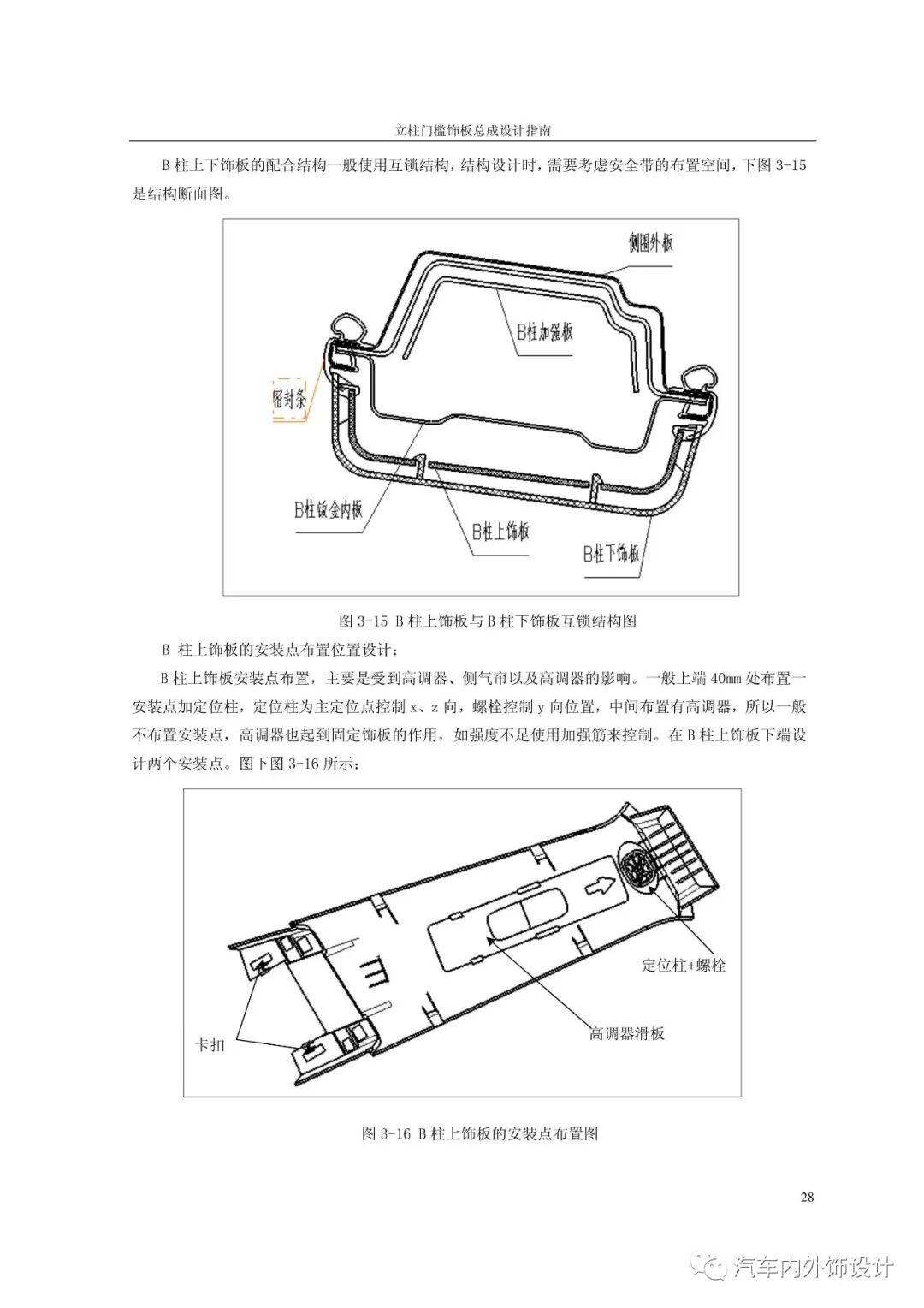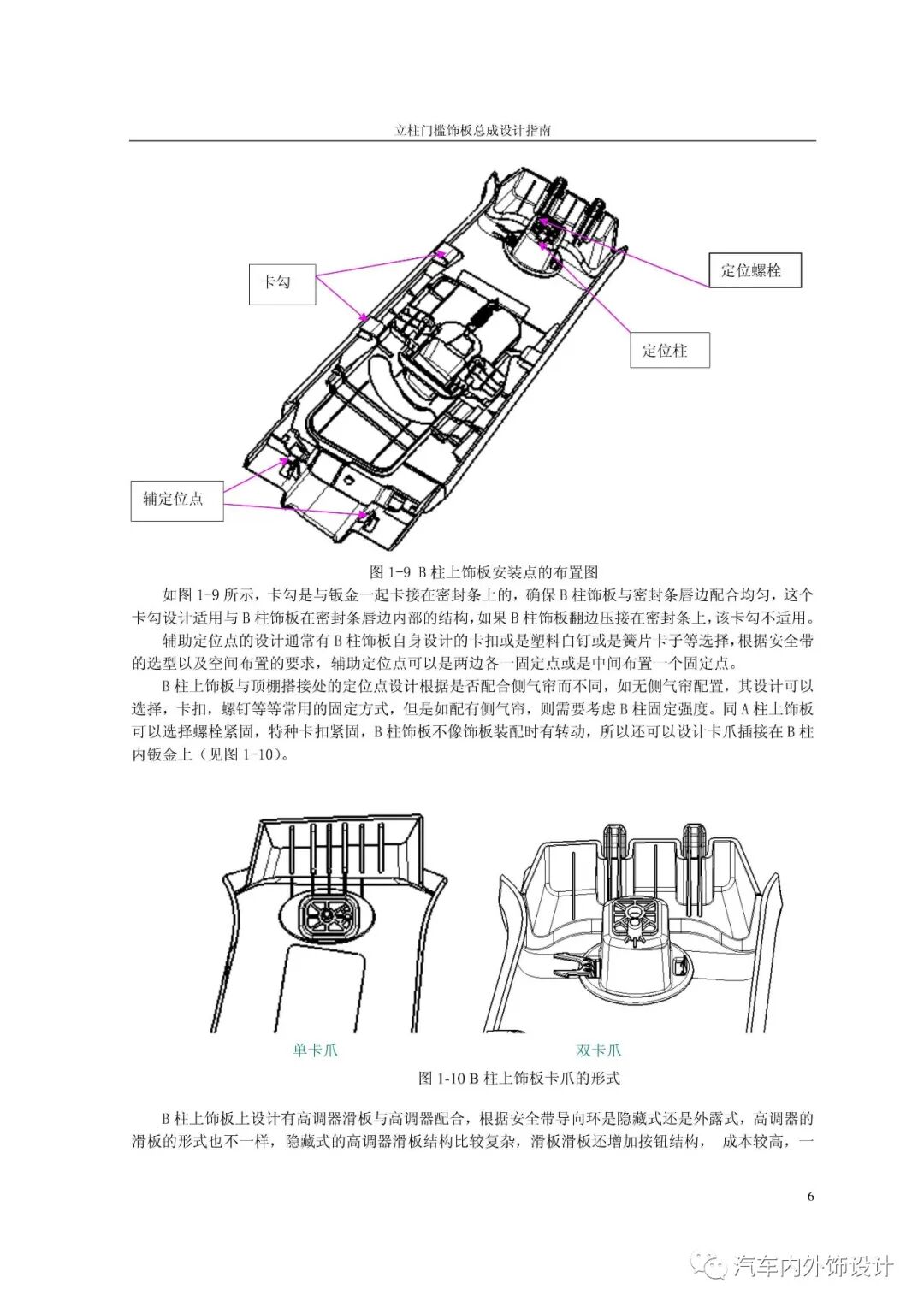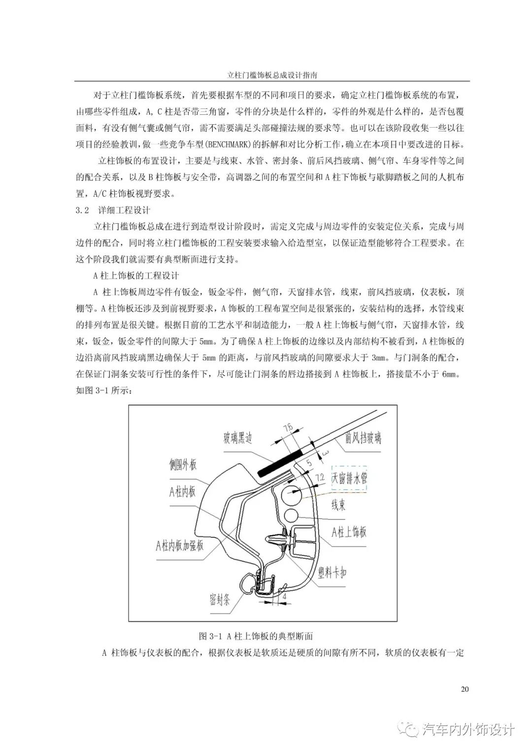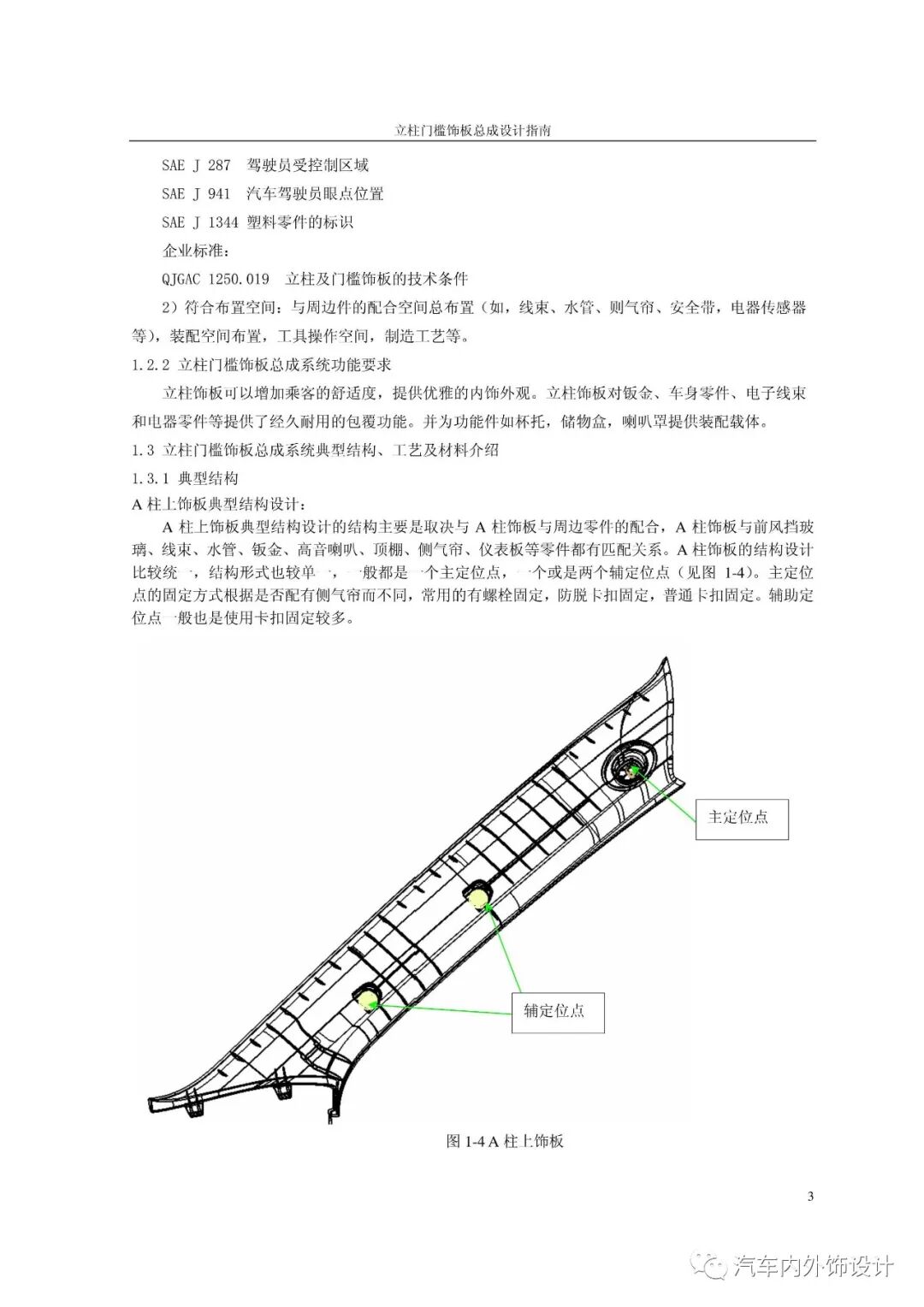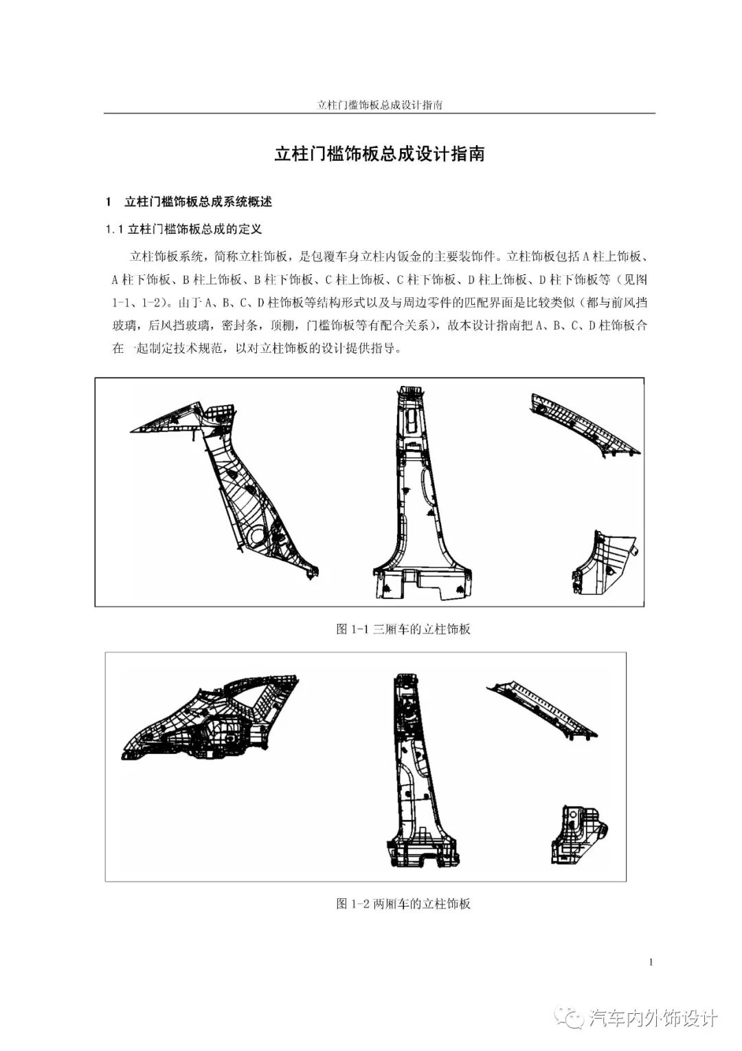立柱饰板系统:简称立柱饰板,是包覆车身立柱内钣金的主要装饰件。立柱饰板包括A柱上饰板、A柱下饰板、B柱上饰板、B柱下饰板、C柱上饰板、C柱下饰板、D柱上饰板、D柱下饰板等。由于A、B、C、D柱饰板等结构形式以及与周边零件的匹配界面是比较类似,本文把A、B、C、D柱饰板合在一起制定技术规范,以对立柱饰板的设计提供指导。