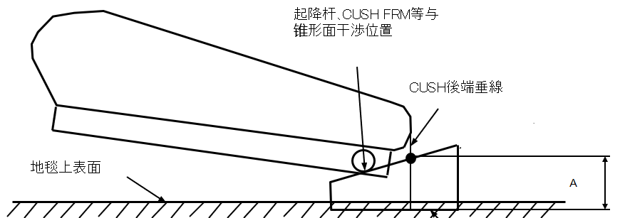 校核时,座椅在设计位置,根据总布置提供的假人踵点位置(一般压陷地毯2mm左右),画上图模型,斜边与座椅下面干涉时停止,然后测量坐垫后端垂线与脚步模型的尺寸A。