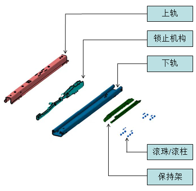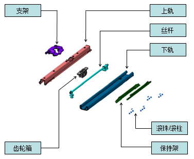 该机构一般由上轨、下轨、锁止机构(手动)、调节机构(电动)、 滚珠滚柱和滚珠滚柱保持架等零件组成。