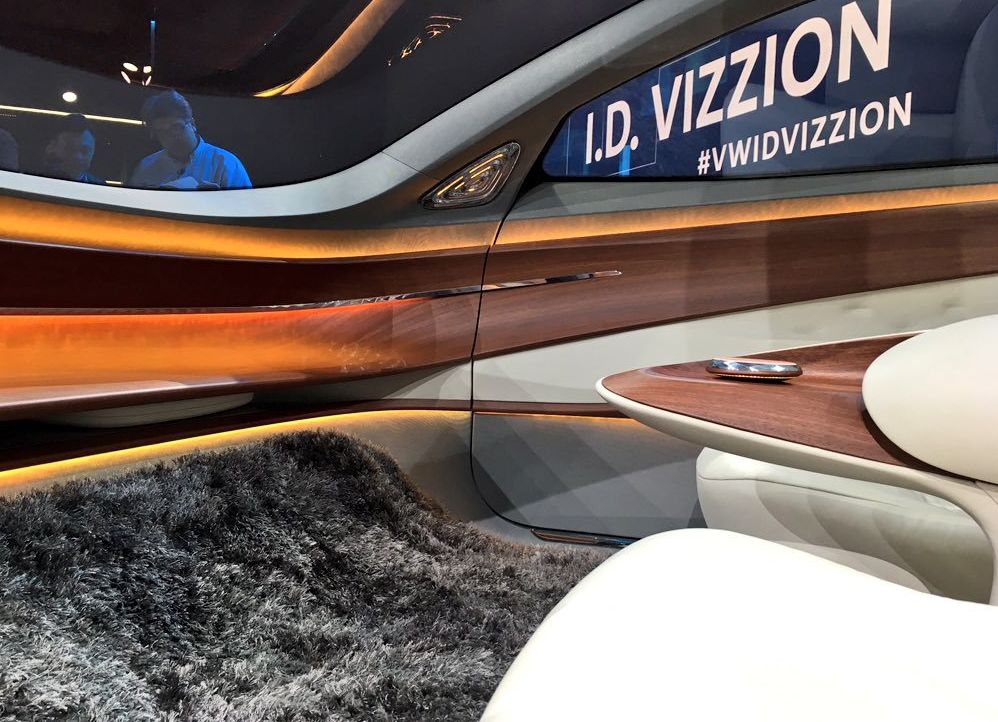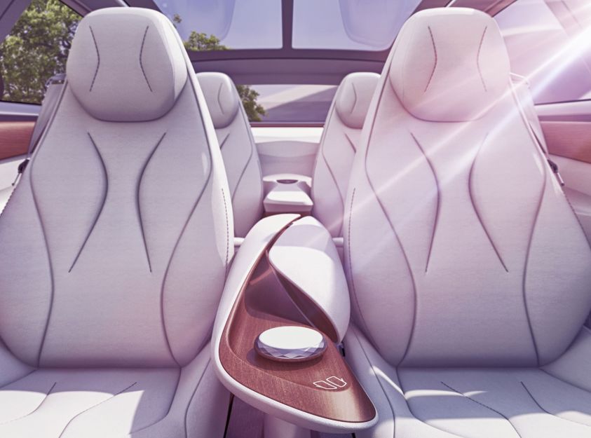 VW的ID Vizzion概念车没有方向盘,四个白色座椅与灰色的毛茸茸地毯、深棕色的木头相映衬。木制座椅靠背被皮革包裹,像西装外套一样有重叠效果,具有层次感。