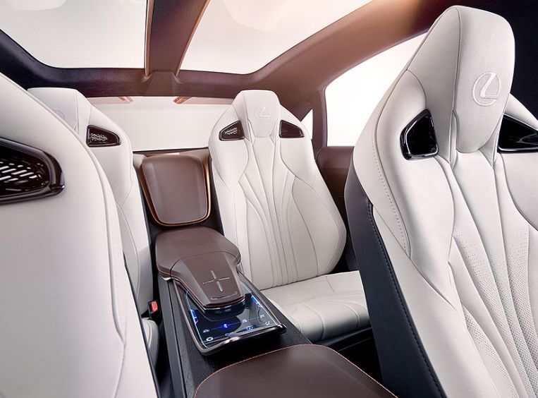 Lexus LF-1的内饰用明亮的白色穿孔皮革包裹的座椅,每把椅子都与黑色和古柯豆皮革内衬相得益彰,内衬以玫瑰金和铜为主色调,与铜色外罩有机融合。