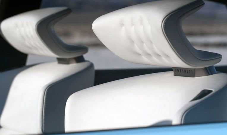 Infiniti Q Inspiration 概念车展示了另一种高对比度的黑白内饰,座椅、中控台和车门均采用柔软的白色皮革装饰,并采用Infiniti专利的菱形圆点绗缝设计,对比鲜明的黑色滚边更赋予了座椅额外的定义,控制台和车门装饰都增加了一个珊瑚橙色的滚边,作为一个小亮点为整个内饰带来了一点温暖。
